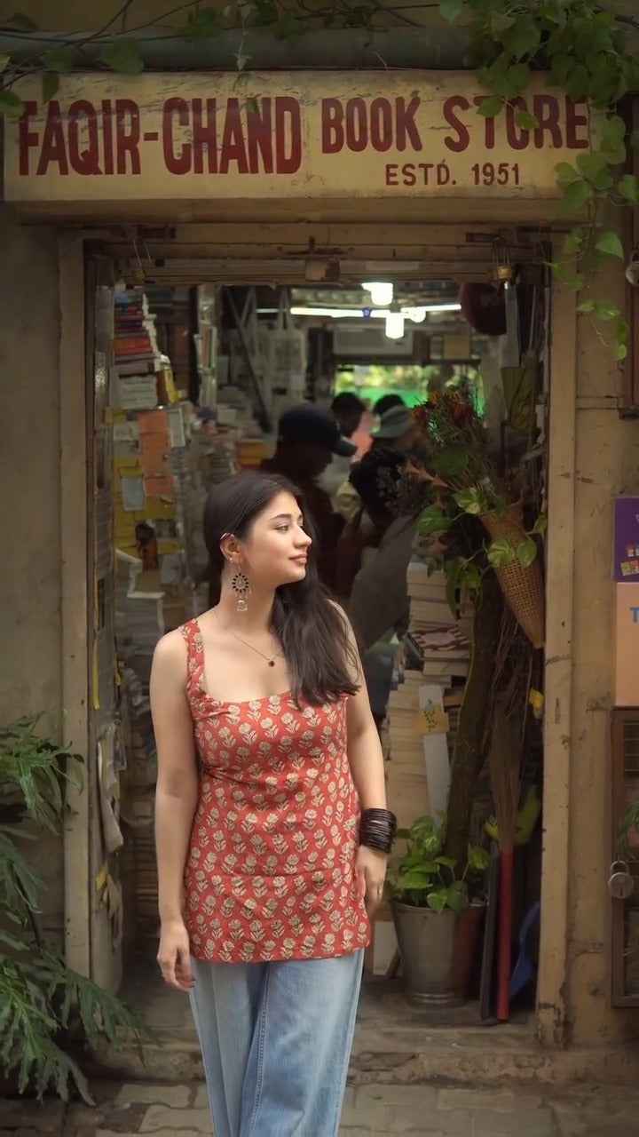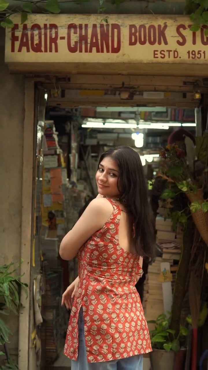 This rust-red sleeveless kurti top, which is made of soft and breathable Poly Reyon for all-day comfort, will allow you to step out in simple style. This adaptable item, which has a flattering square neckline and a modern floral motif, looks great with jeans or high-waisted trousers. It combines classic charm with contemporary minimalism, making it perfect for informal get-togethers, bookstore excursions, and brunch dates. For a laid-back yet elegant combination, finish your look with bold bangles and earrings. Get a classic item to add to your regular wardrobe right now!