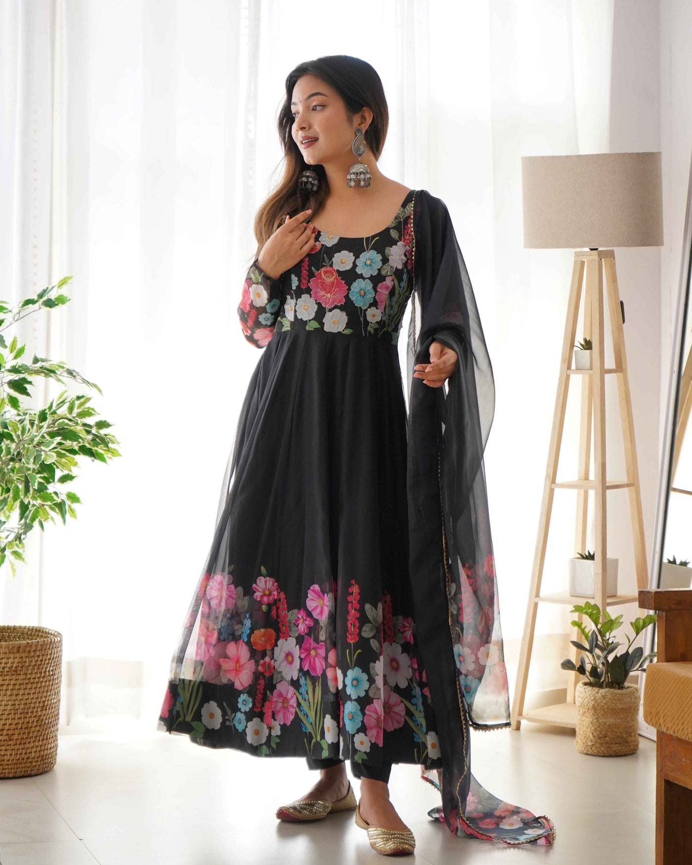 Black Pure soft organza silk fabric fully flair kali pattern Kurta Suit
